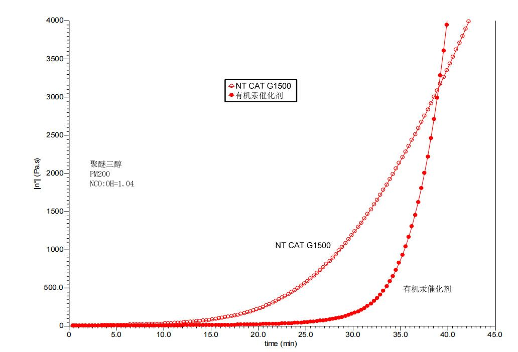 本產(chǎn)品針對聚氨酯CASE領(lǐng)域產(chǎn)品而開發(fā),提供類似于汞催化劑的凝膠時間和固化性能,實(shí)驗(yàn)曲線對比圖如下: